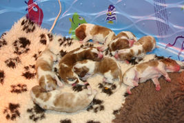 Chloe's December 2021 litter, again sired by Darwin, produced eight pups, four of each gender. After this litter it was decided to spay and rehome Chloe. She is now known as Ruby and continues to harass squirrels.